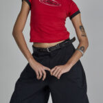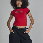 a baby tee tem modelagem babylook, garantindo um caimento ajustado ao corpo. ela se destaca pelos detalhes em preto na gola e mangas, que contrastam com o vermelho da peça, e pela estampa exclusiva em serigrafia.