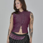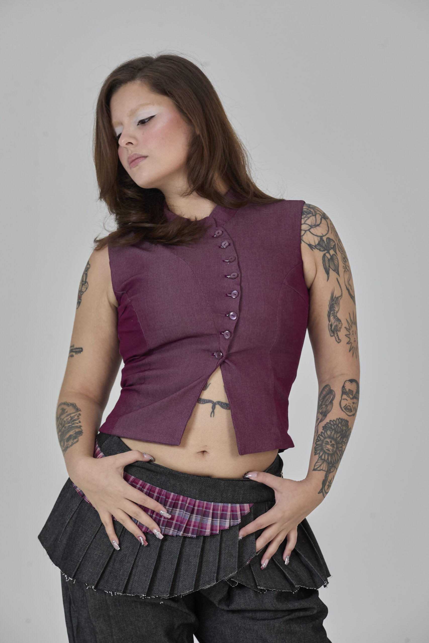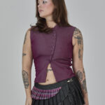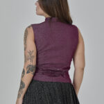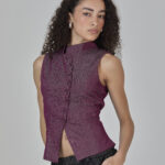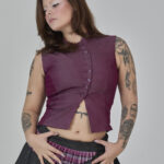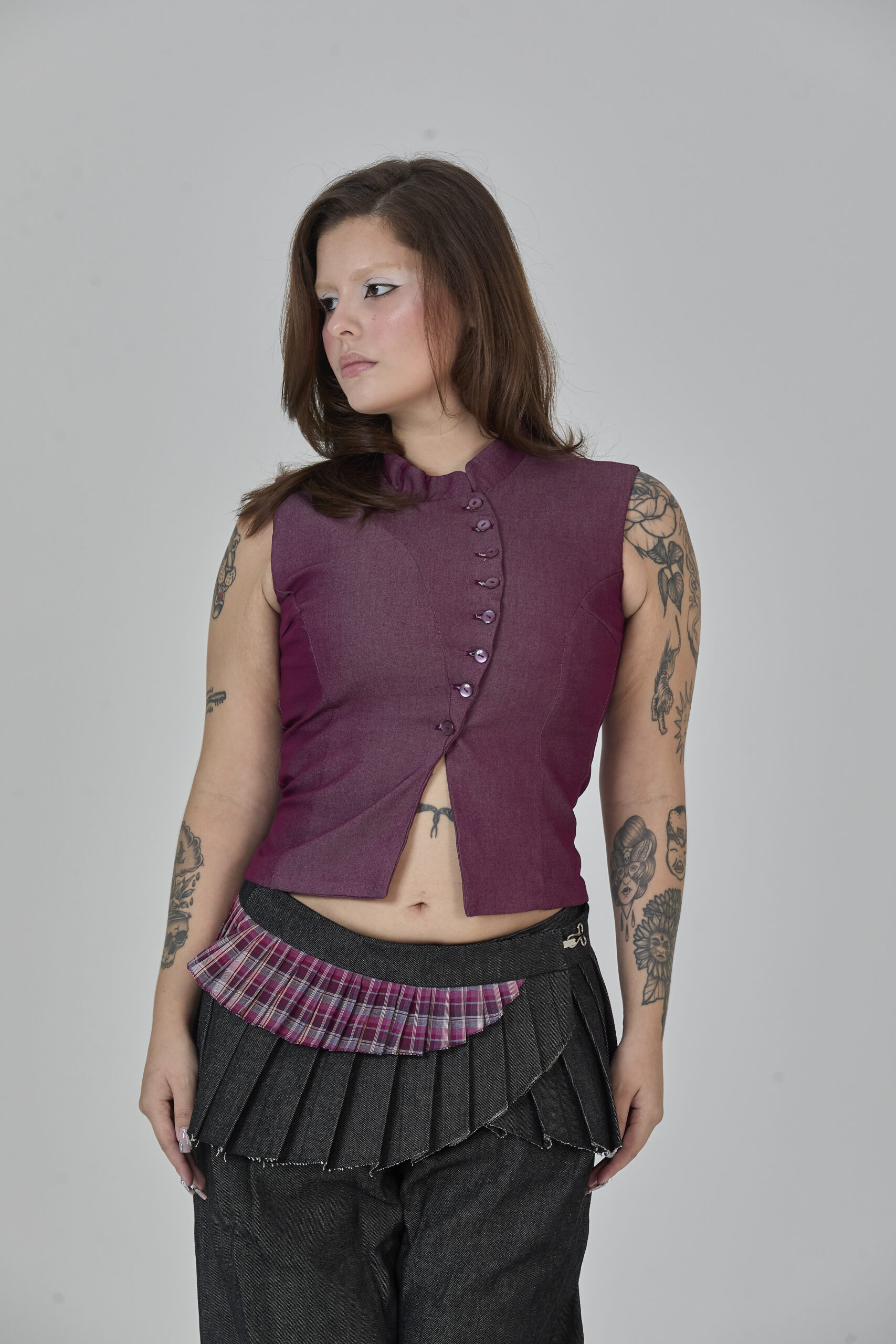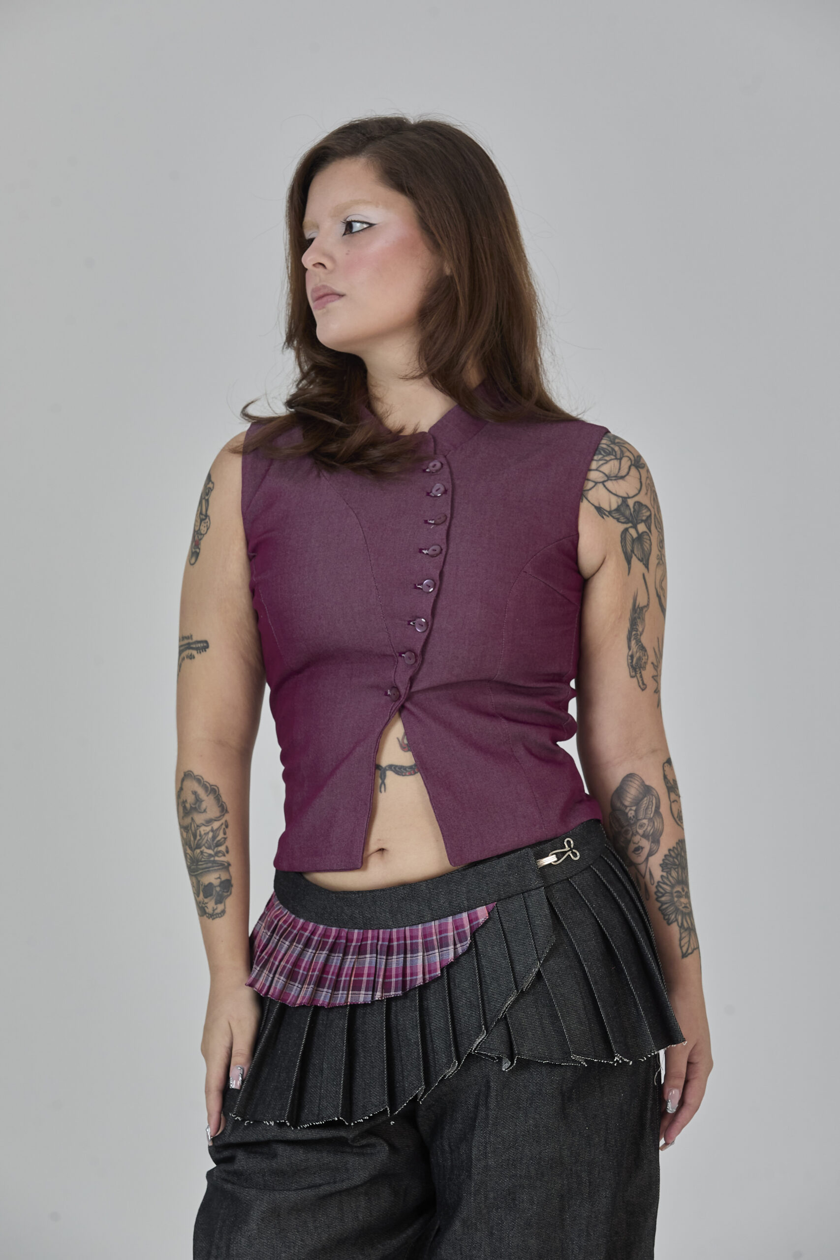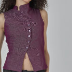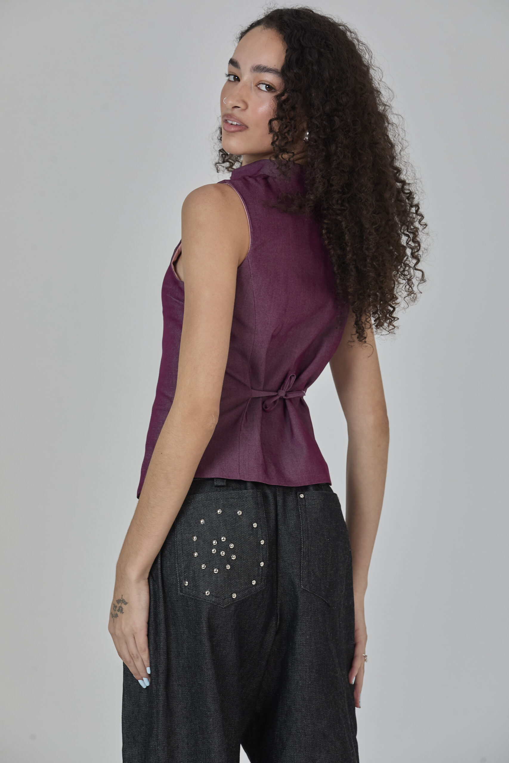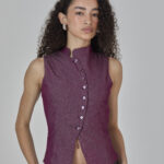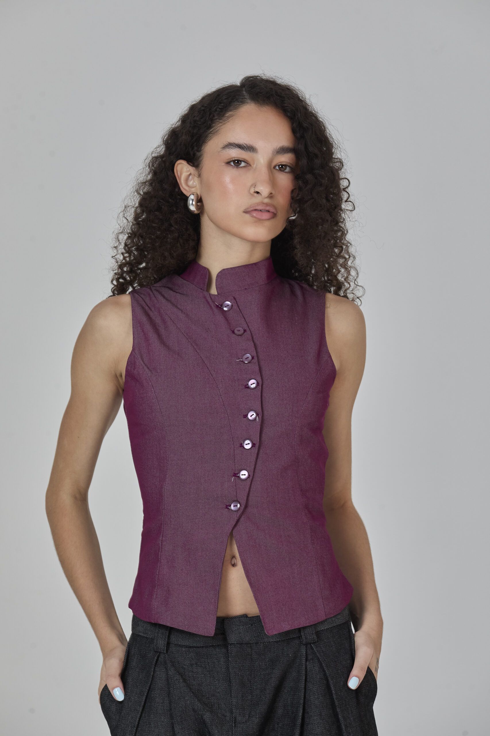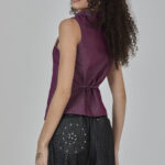 colete roxo em jeans leve, com recortes que formam uma modelagem assimétrica e fechamento em botões. peça completamente forrada em cambraia de algodão rosa. possui colarinho tipo padre e ajuste traseiro por amarração, para um caimento personalizado.