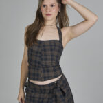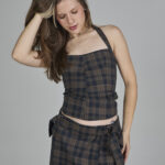 a modelagem do corset xadrez marrom apresenta recortes estruturados com alças tipo halter amarradas no pescoço. o fechamento em espartilho regulável nas costas garante um ajuste preciso e perfeito ao corpo.